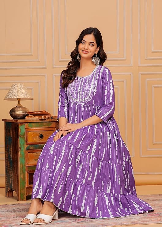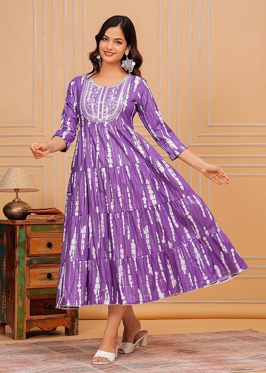 Women’s Purple Tie Dye Lurex Midi Dress, 3/4 Sleeve, Tiered Design with Lace Embroidered Yoke, Casual Wear