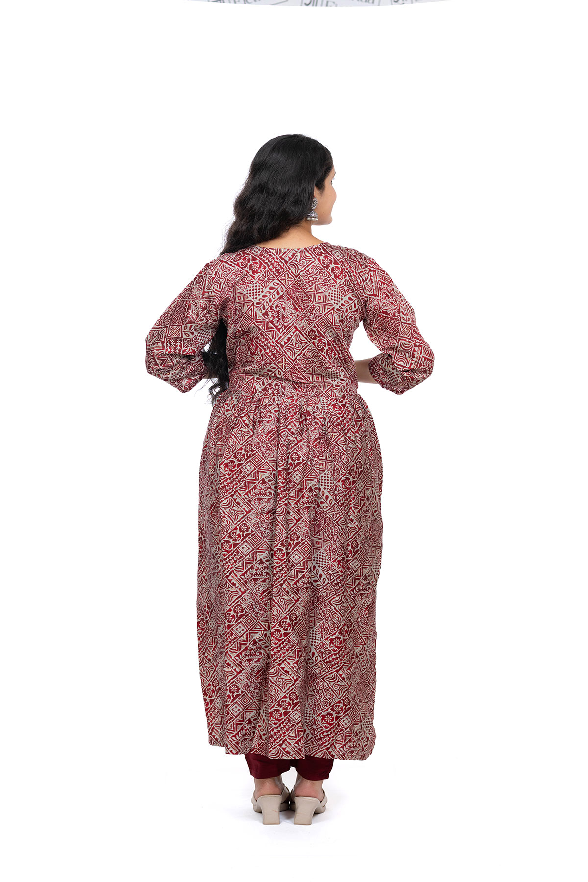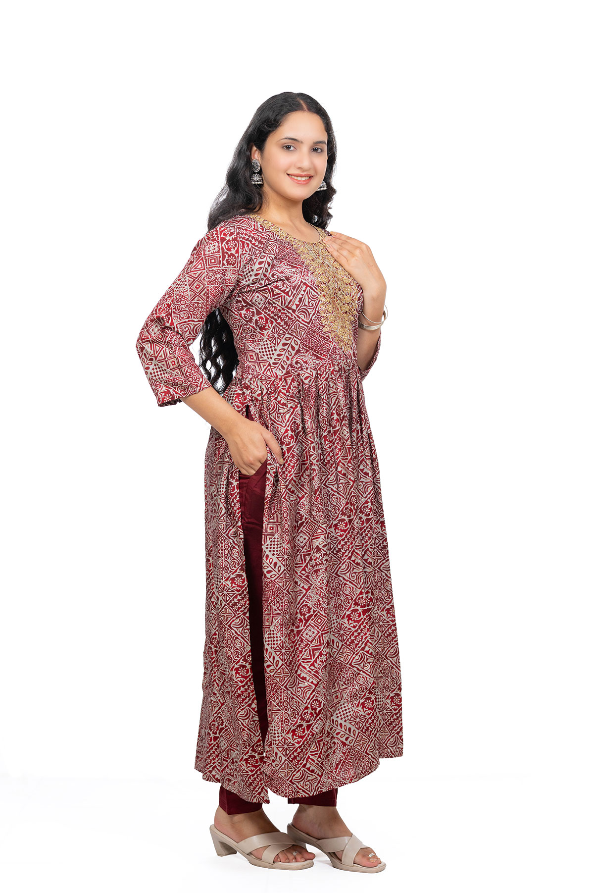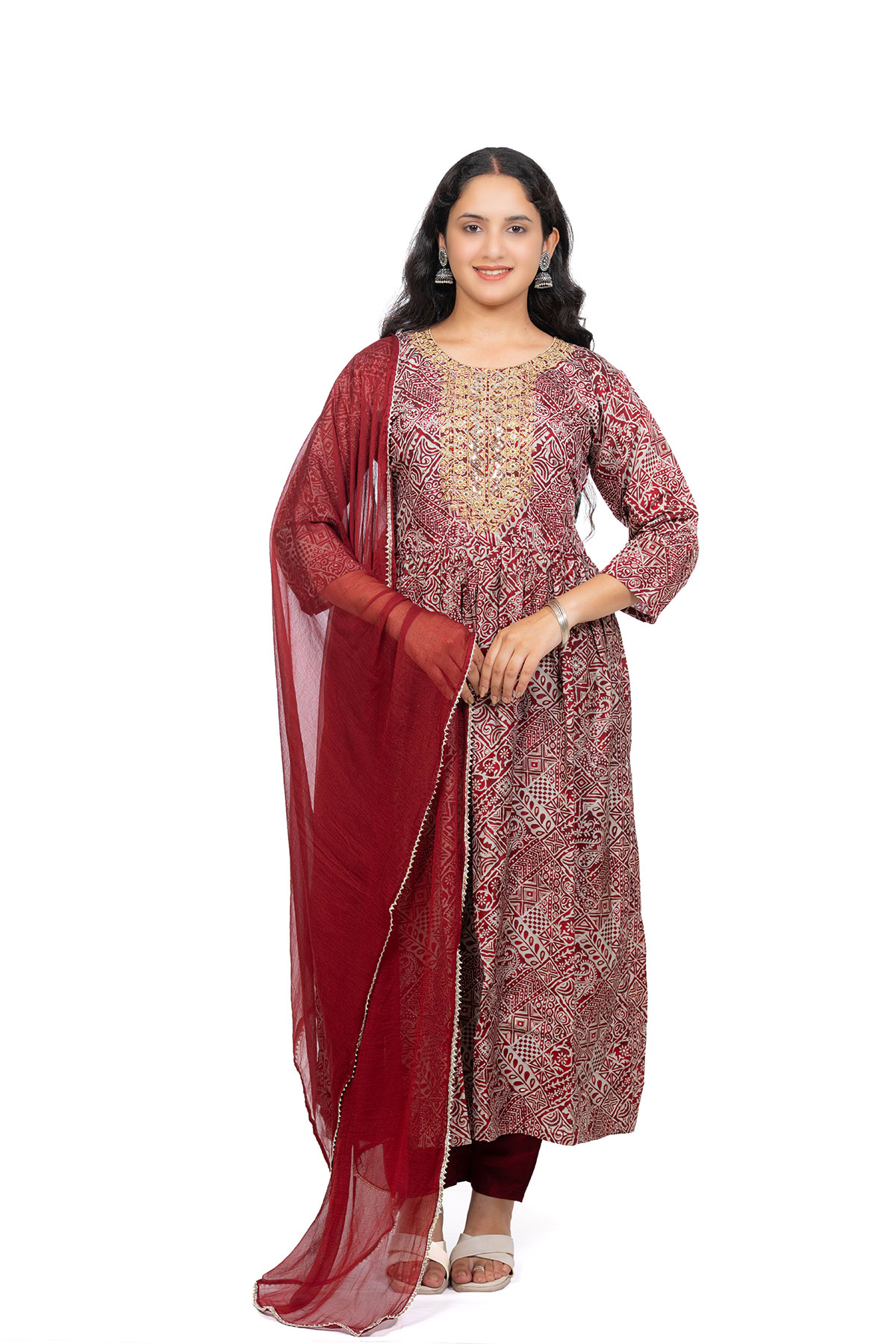 Women’s Traditional Modal Fabric Kurti Set with Dupatta, Maroon and Gold Print, 3 Piece Ethnic Dress