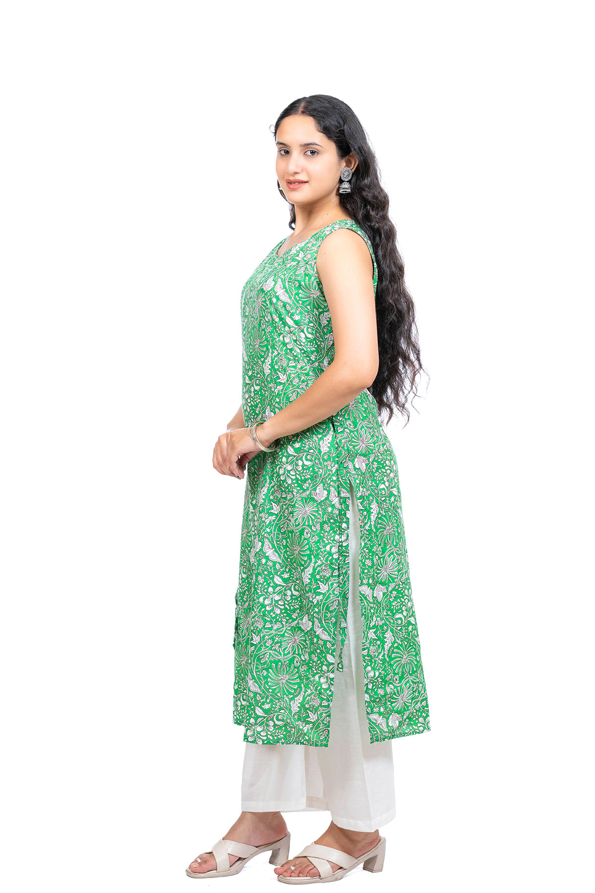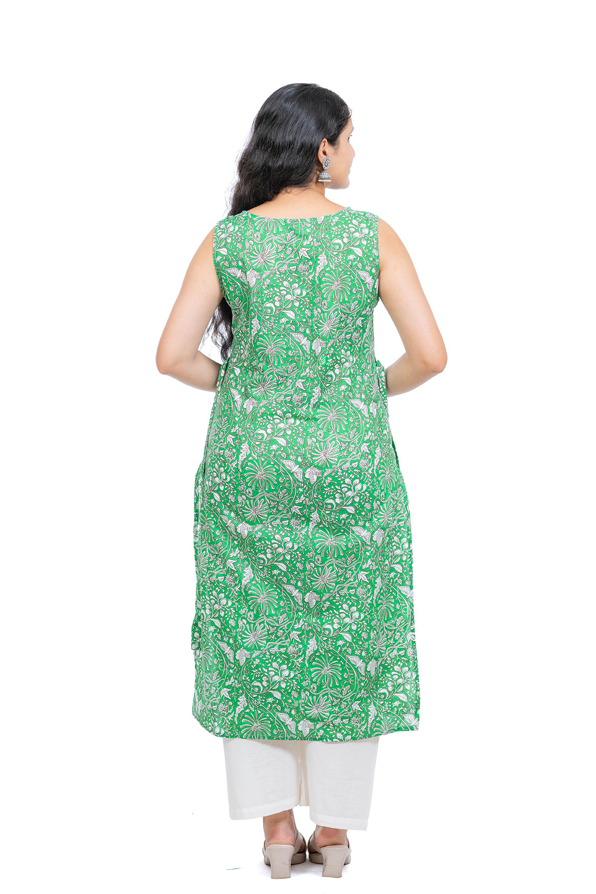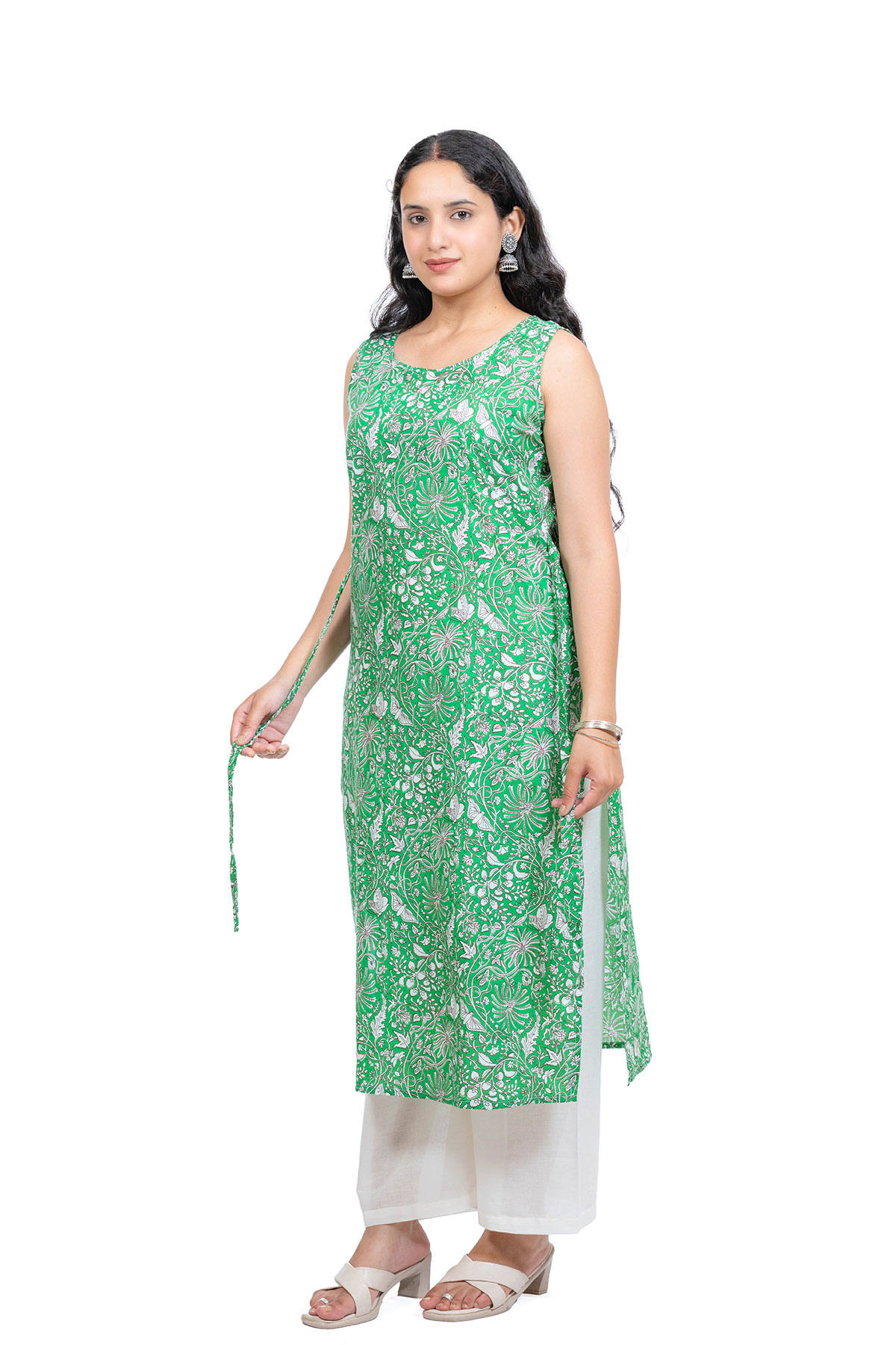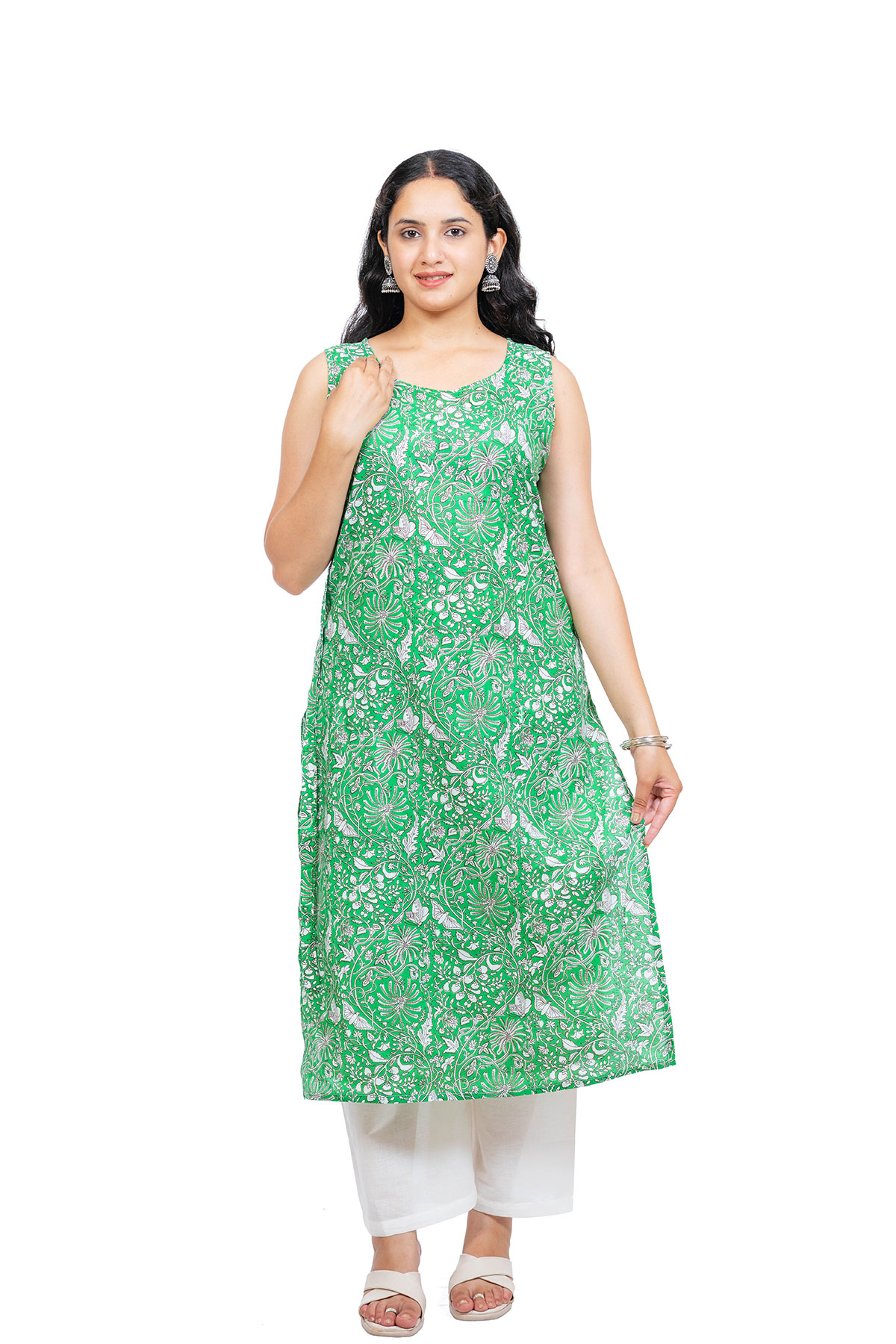 Elevate your ethnic wardrobe with this stunning two-piece cotton kurta set in refreshing green and white. The kurta features an enchanting floral print pattern with intricate details of blooms and birds dancing across the fabric in white against a vibrant green backdrop. The sleeveless design offers perfect comfort for warm weather, while the A-line silhouette creates a graceful, flowing appearance. The square neckline adds a contemporary touch to this traditional ensemble. Paired with crisp white palazzo pants, this set strikes the perfect balance between style and comfort. The breathable cotton fabric ensures all-day comfort, making it an ideal choice for both casual outings and festive occasions. The versatile design allows for easy mixing and matching with other wardrobe pieces. The kurta’s length provides elegant coverage while maintaining a modern aesthetic. Perfect for summer gatherings, casual wear, or festive celebrations, this ensemble combines traditional charm with contemporary styling.