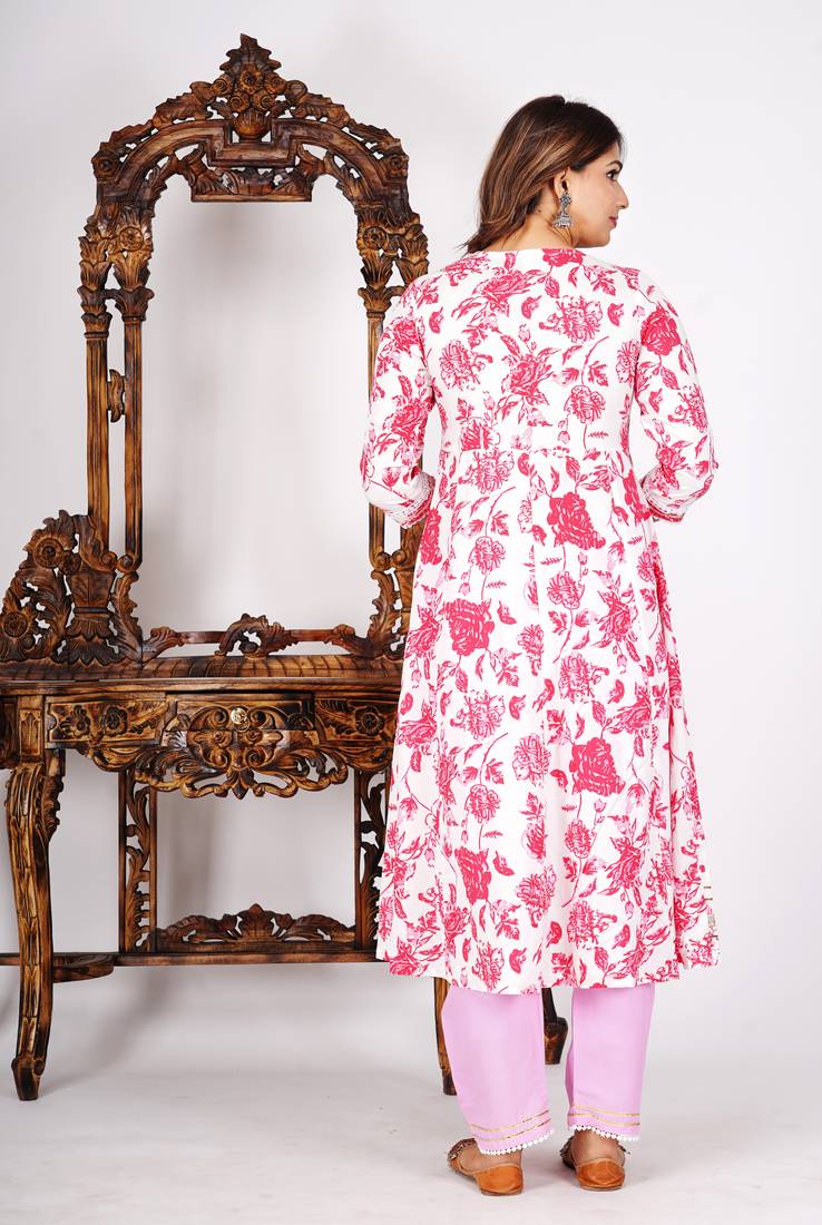 Elevate your ethnic wardrobe with this stunning two-piece Anarkali kurti set. The pristine white base adorned with vibrant pink floral prints creates a mesmerising visual appeal. The Anarkali kurti features a graceful flared silhouette, complemented by comfortable three-quarter sleeves and a round neckline. Crafted from soft, breathable rayon fabric, this ensemble ensures comfort throughout the day. The kurti is perfectly paired with matching pink pants that feature delicate trim detailing at the hem. This versatile set is ideal for festive occasions, casual outings, or office wear. The traditional design elements combined with contemporary styling make it a must-have addition to your wardrobe. The flowing Anarkali cut creates an elegant drape while maintaining ease of movement. To maintain the garment’s beauty, gentle hand wash is recommended. Available in multiple sizes, this ensemble offers both style and comfort for the modern woman.